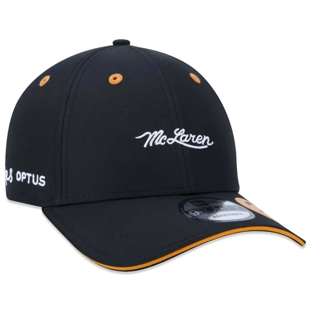 A frente do boné é bordada com o logotipo da McLaren, a equipe de automobilismo mais vitoriosa da história da Fórmula 1.