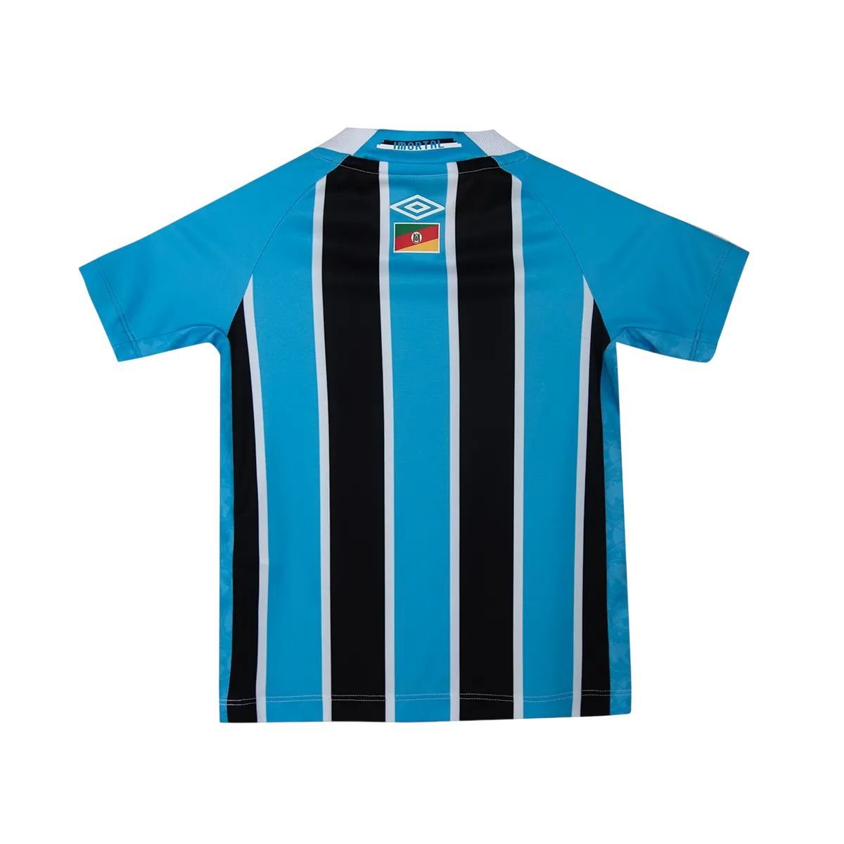 Detalhes: Na parte de trás do modelo, exibe etiqueta com a palavra ‘Imortal’ acima da bandeira do Rio Grande do Sul, Patch especial na barra inferior com a frase “Nos quatro cantos do mundo, com o Grêmio onde o Grêmio estiver