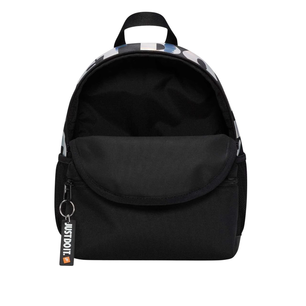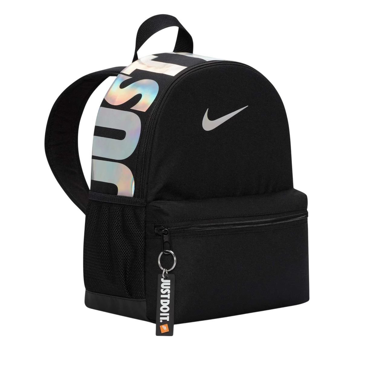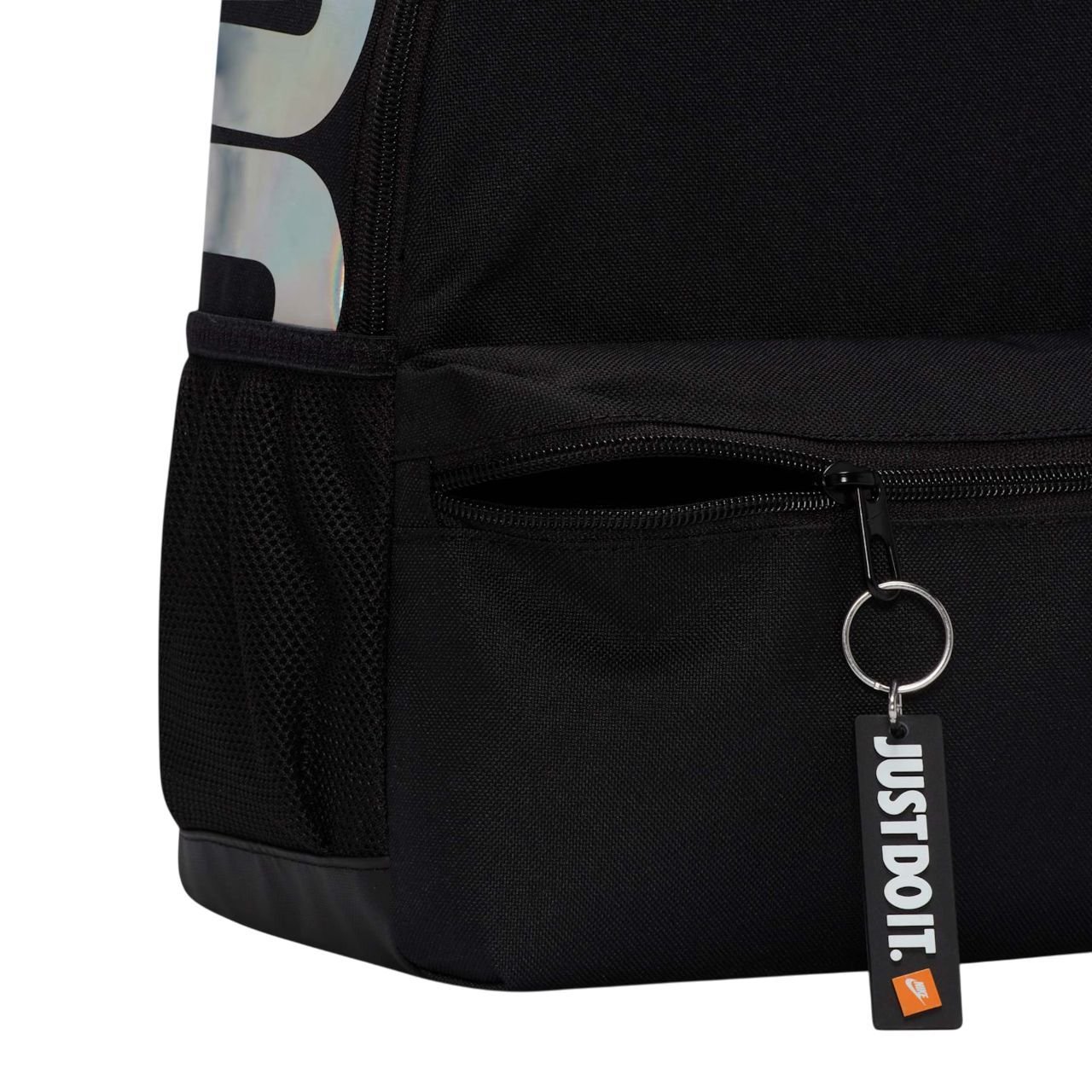 Os práticos bolsos laterais são perfeitos para guardar garrafas de água ou pequenos itens essenciais, mantendo tudo organizado e de fácil acesso. Para um toque de autenticidade, a mochila vem com um chaveiro exclusivo e a icônica estampa "Just Do It.", elevando o estilo Nike a cada uso.