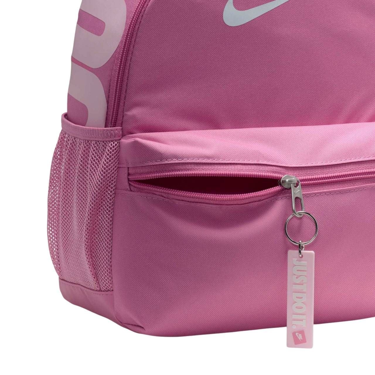 Os práticos bolsos laterais são perfeitos para guardar garrafas de água ou pequenos itens essenciais, mantendo tudo organizado e de fácil acesso. Para um toque de autenticidade, a mochila vem com um chaveiro exclusivo e a icônica estampa "Just Do It.", elevando o estilo Nike a cada uso.
